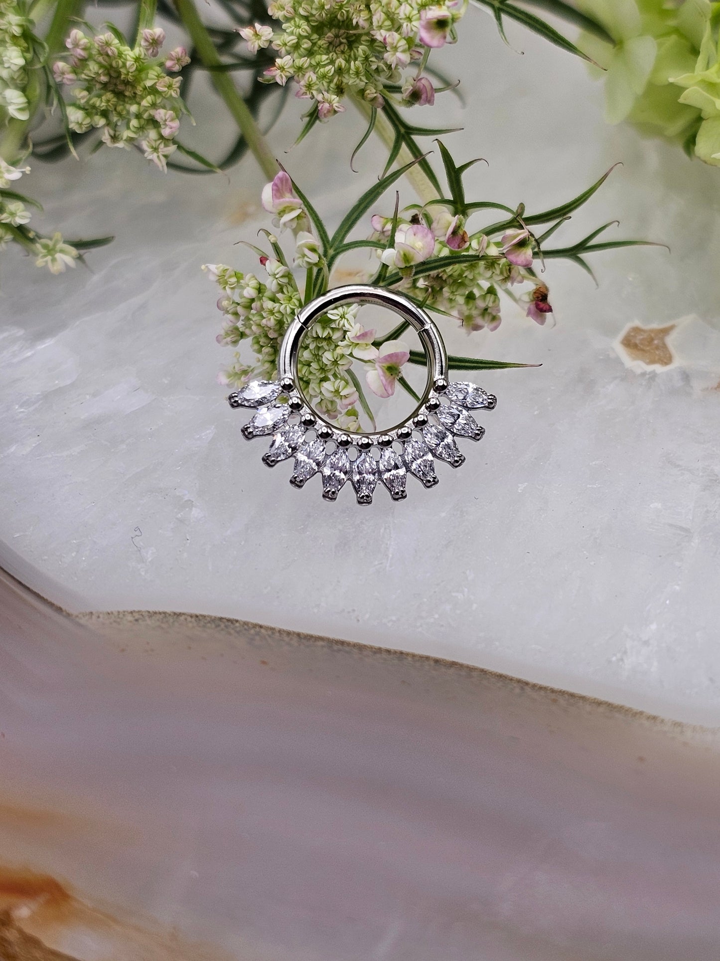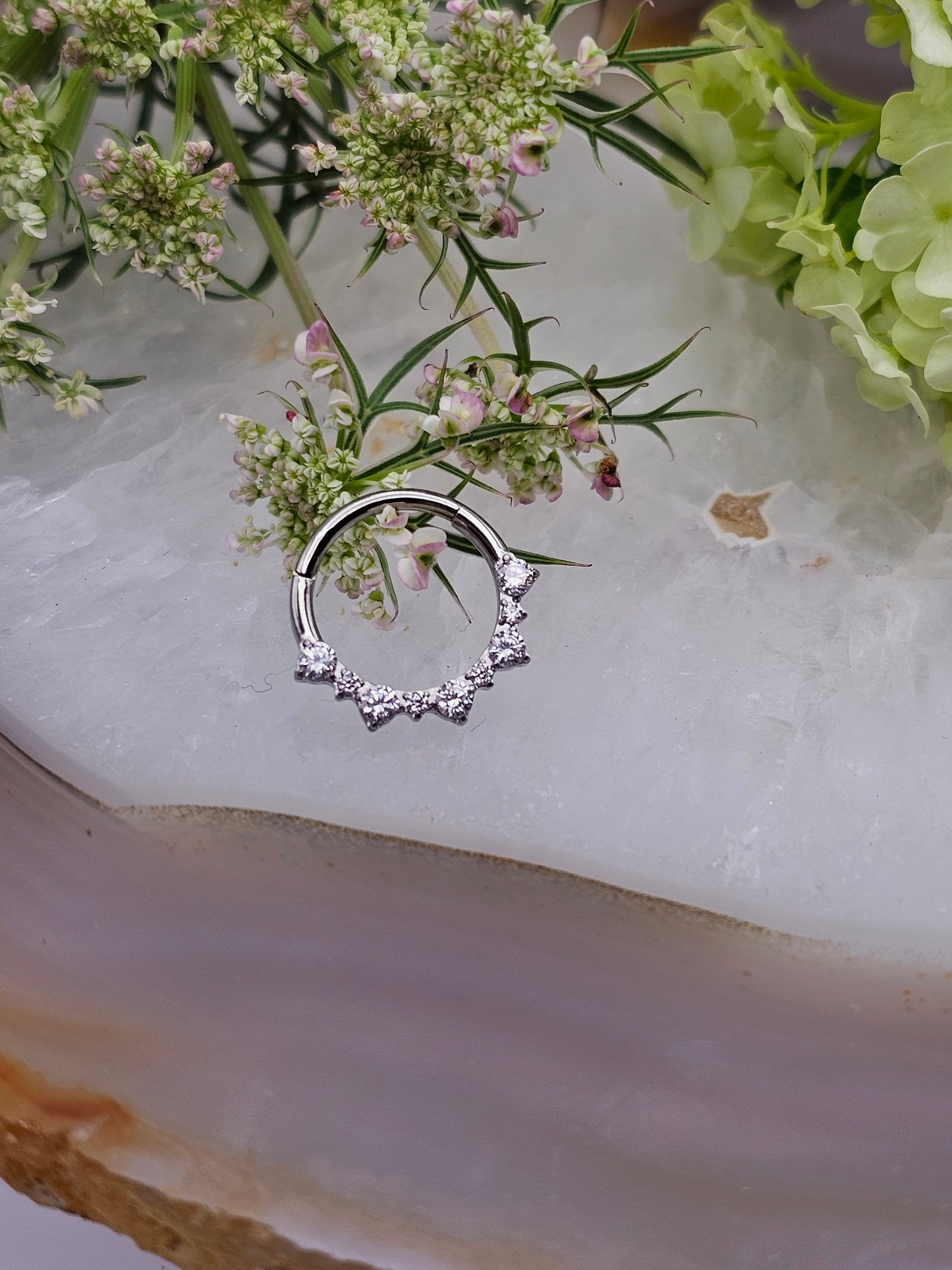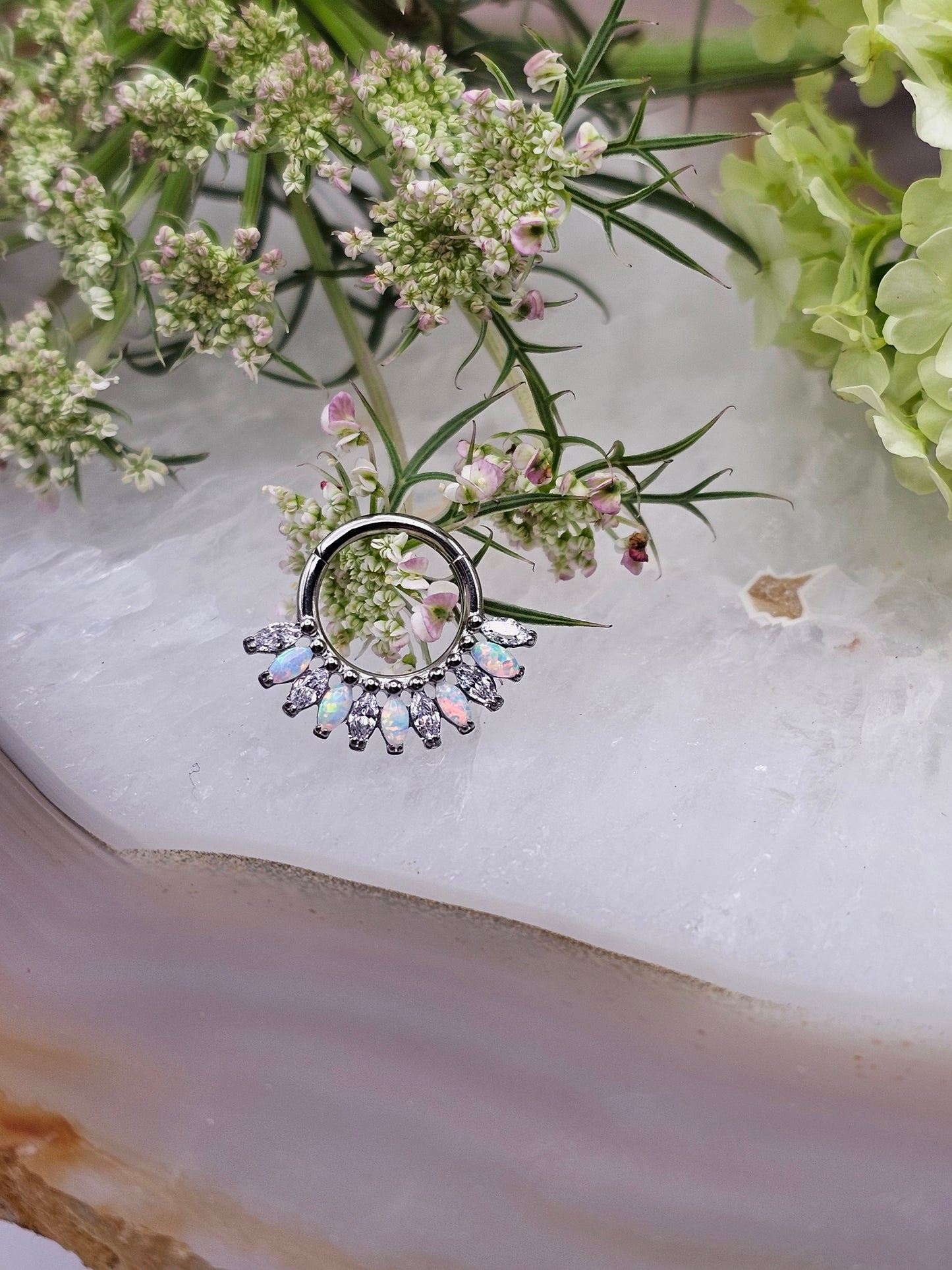 Infinite Body Jewelry titanium 16g 5/16" Tofino hinge ring with cz and white opal